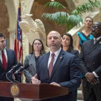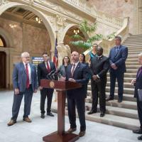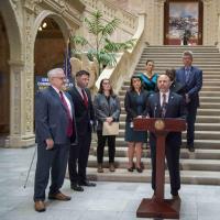 Rep. Bob Merski and others members of the Urban Affairs Caucus speak at a news conference to discuss a package of bills to fight blight in Pennsylvania.